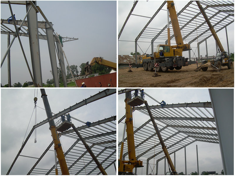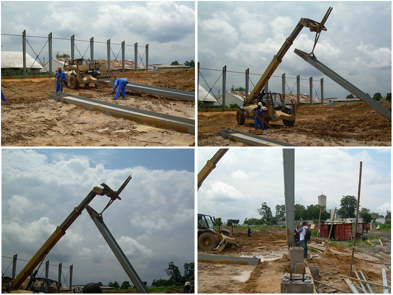 剛果倉庫位于非洲,占地面積3500平方米。主體框架用H型變截鋼制作完成。所有鋼架結(jié)構(gòu)均由螺栓連接;A(chǔ)離地面1米以作為防水臺(tái)。以下為部分建筑圖片展示:
